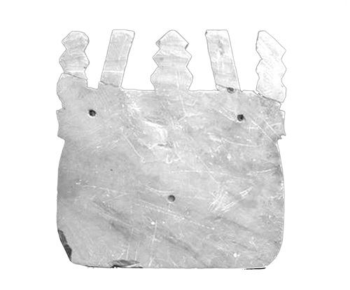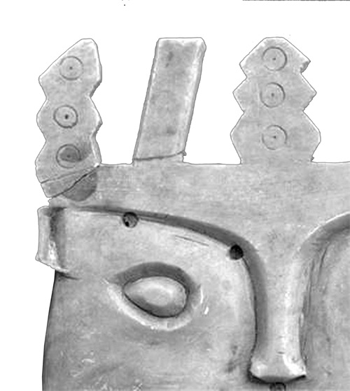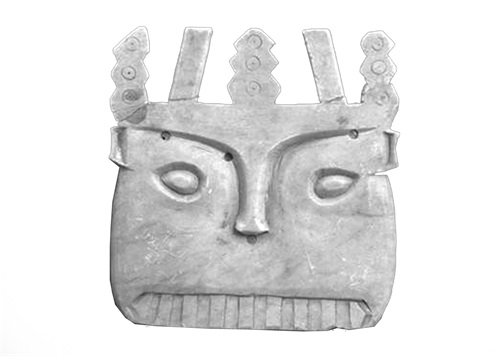 该面具宽17.3厘米、高16.5厘米、厚1.9厘米,重843克。白褐色,兽面头插三个珠纹锯齿状和两个方柱状饰物,面形方正,面颊微隆,鼻梁瘦削与剑眉相连。双眼近三角形,两眼突出,阔口,上唇平直,口与面等宽,有九齿,两侧各有一犬牙,整个面部有四个圆形小孔。其面部表情,夸张、肃穆、狰狞。