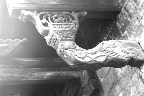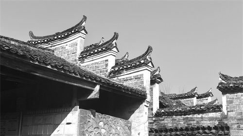 进入古村,院落呈长方形,坐西向东,占地四万六千多平方米,建筑面积达二万二千平方米,八条青石板巷道自东向西深入,把整个院落分成九纵,也就是九栋正屋。而每栋正屋旁边都并列着两排横屋,一共是十八座。所有的房屋都由青石板巷道连接,巷巷相通,道道相连,可以脚不沾泥往来于每栋房屋之间。而每座正屋的大门均是用长方形大青石柱做的门框,门楣上刻狮兽麒麟等瑞物,非常气派。屋内最宽敞的地方是堂屋,地面是用三合泥铺成的,堂屋前持天井、照墙和门楼,两侧用木壁分隔成卧房和厢房。天井全是用青石板铺盖,看不见明显的下水道,却从不存水,说明其排水系统安排得十分巧妙科学。房屋的门窗、墙壁、栋梁上刻有福、禄、寿、八仙、花鸟、龙凤等各种不同的图案,雕刻精美,形态逼真,给人栩栩如生之感。我不禁想起巴金先生笔下所描绘的北京四合院,又仿佛看到了当年居住在这里的人们,非常讲究礼仪谦恭,翁叔兄弟、婆媳妯娌之间绝少矛盾争执,大家和睦相处,路不拾遗,夜不闭户,一派其乐融融的和谐景象。