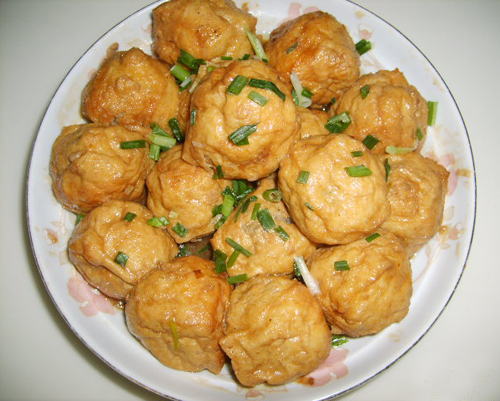 该菜是以猪肉和油豆腐为主料的菜肴。宁远酿豆腐的制作与其他地方不同的是,首先油炸豆腐要用茶油将水豆腐炸成像桃子一样大小匀称,色金黄,有韧性,中间空心的油炸豆腐。将鲜五花肉、蒜白、干红辣椒剁成茸,加调料拌匀做成馅。将油炸豆腐撕开一小口塞满馅料,使其变成圆鼓鼓的肉酿豆腐丸子。生豆腐丸子入锅煮至豆腐表皮起了一层层皱纹,收浓汁即可。每逢过年过节,亲友欢聚时宁远县家家户户都制作这道菜,此民俗流传至今。