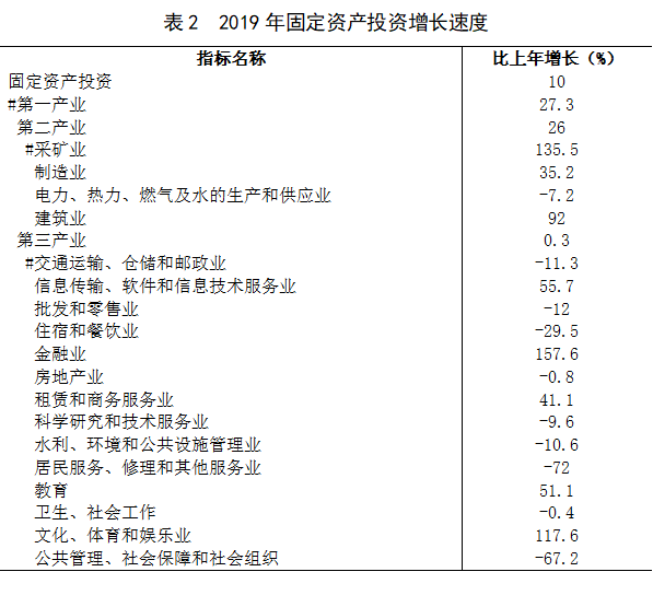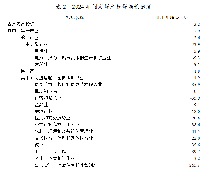 全年固定资产投资[5]比上年增长3.2 %。分经济类型看,国有投资下降28.4 %;非国有投资增长10.9 %。分投资方向看,工业投资增长2.6 %,民生投资增长11.0 %,生态投资增长1.8 %,基础设施投资增长8.3 %,高技术产业投资下降6.6 %,工业技改投资增长22.5 %。
