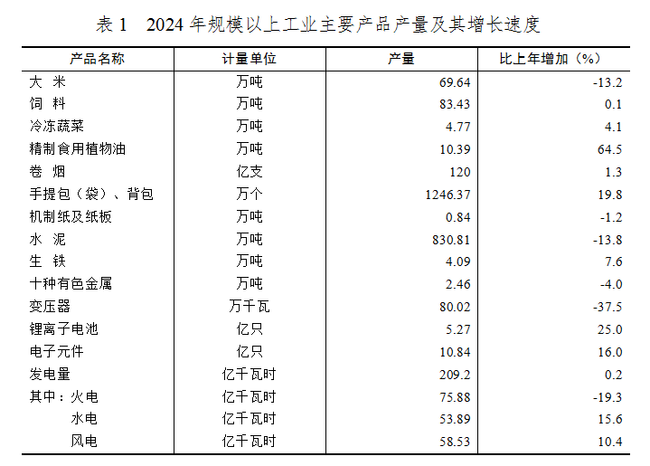 分行业看,黑色金属冶炼和压延加工业,铁路、船舶、航空航天和其他运输设备制造业,化学原料和化学制品制造业增加值分别增长45.1 %、35.8 %、13.7 %。分产品看,全市全年规模以上工业统计的产品中,精制食用植物油10.39万吨,增长64.5 %;锂离子电池5.27亿只,增长25.0 %;手提包背包1246.37万个,增长19.8 %;电子元件10.84亿只,增长16.0 %;生铁4.09万吨,增长7.6 %;发电量209.2亿千瓦时,增长0.2 %,其中火电75.88亿千瓦时,下降19.3 %,水电53.89亿千瓦时,增长15.6 %,风电58.53亿千瓦时,增长10.4 %。