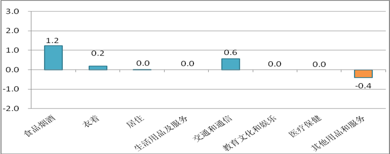 12月份,食品烟酒价格上涨1.2%,交通和通信价格上涨0.6%,衣着价格上涨0.2%,居住、生活用品及服务、教育文化和娱乐、医疗保健价格均持平,其他用品和服务价格下跌0.4%。