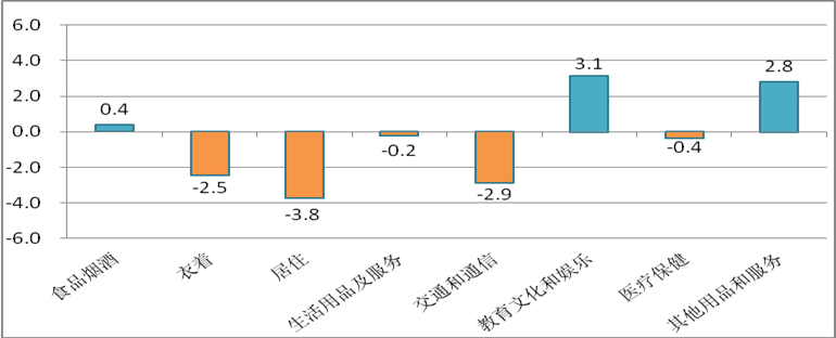 12月份,教育文化和娱乐价格上涨3.1%,其他用品和服务价格上涨2.8%,食品烟酒价格上涨0.4%,居住价格下跌3.8%,交通和通信价格下跌2.9%,衣着价格下跌2.5%,医疗保健价格下跌0.4%,生活用品及服务价格下跌0.2%。