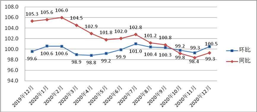 永州市CPI环比、同比指数图(2019.12-2020.12)