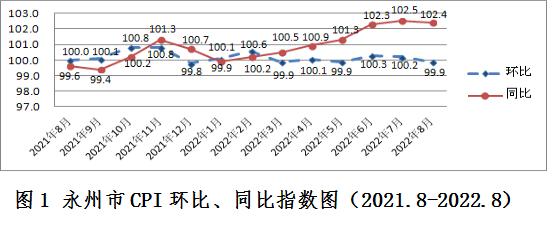 8月份,永州市居民消费价格(CPI)同比上涨2.4%,涨幅较全省低0.1个百分点,在市州中居第七位。其中,食品价格上涨5.0%,非食品价格上涨1.9%;消费品价格上涨3.9%;服务价格上涨0.2%。永州CPI环比下跌0.1%。其中,食品价格上涨0.8%,非食品价格下跌0.3%;消费品价格下跌0.1%;服务价格下跌0.1%(见图1)。
