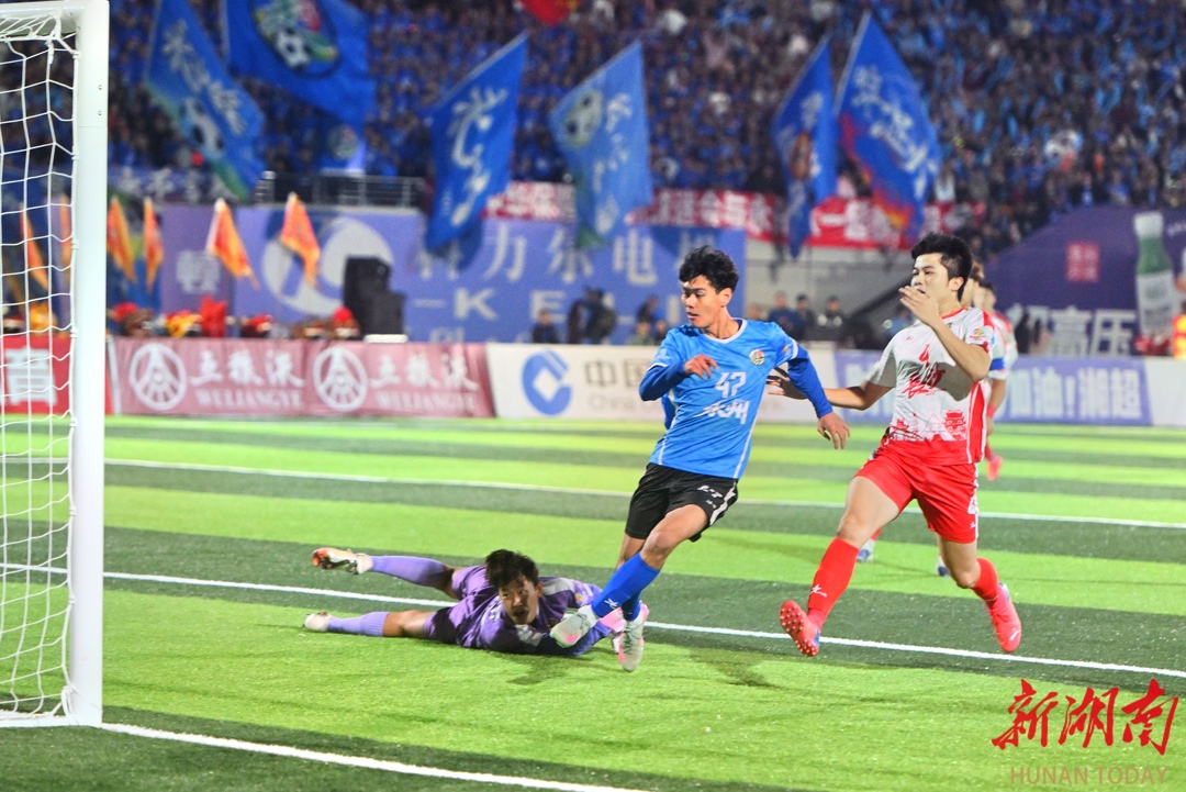 “湘超”永州队打破长沙队“零失球”金身。郭立亮 摄