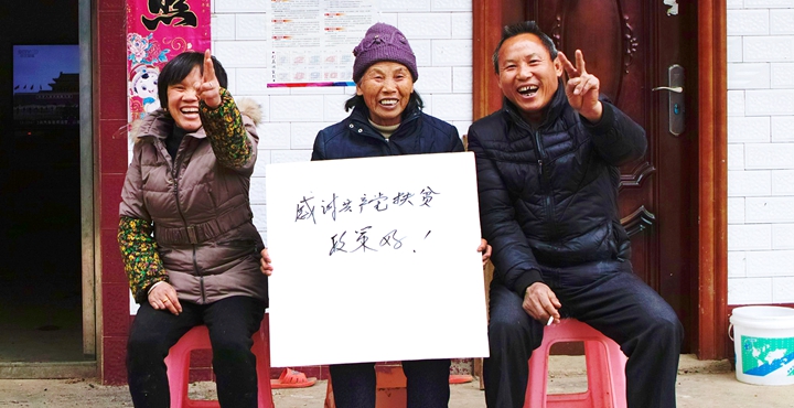 1月1日,零陵区石山脚乡光明村,脱贫户对摄影师摆出胜利的手势。当天,永州市摄影家协会开展“脱贫感恩谁”摄影服务下乡活动,给脱贫户拍全家福,村民写下了发自内心的感恩话语,摄影师用影像记录了脱贫村民的变化。光明村是该区的一个典型贫困村,2017年,全村达到整体脱贫标准,70多户村民全部摘掉了贫困的帽子。 张建利 冯超 摄影报道