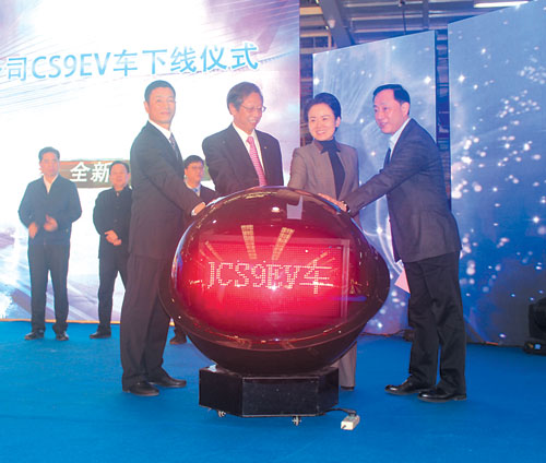 1月12日,市委书记、市人大常委会主任李晖,市委副书记、市长赵应云,长丰集团党委书记、董事长、猎豹汽车股份有限公司CEO李建新,长丰猎豹汽车有限公司总经理邓菊发共同开启启动球,猎豹CS9EV新能源汽车正式下线。 孙存准 摄