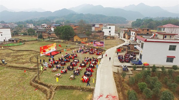 永州新闻网讯(通讯员 严洁 祖智 申军 黄敏)2月12日是腊月27,东安县鹿马桥镇天堂村里欢声笑语、春意融融。一百多名返乡年轻人为村里七十岁以上老人捐款筹办的慈孝团年宴在村中心举行,现场迎风飘扬的一面党旗,格外引人注目。