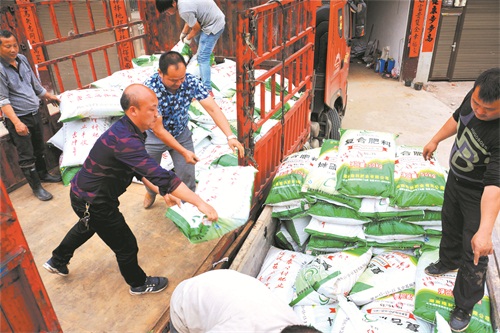 4月12日,宁远县仁和镇谢福山村村民在家门口卸载化肥。今年,宁远县100余名种粮大户成立种粮协会,通过统一农资购买、统一农机调配和统一粮食销售,促进农业增效农民增收。 乐水旺 摄