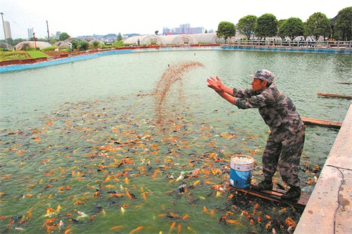 零陵区香零山村充分利用潇水河水资源优势,创新发展乡村旅游业。今年3月,该村多方投入200多万元,自建“花港观鱼”休闲度假区,此项目将在“五一”正式对外开放。图为4月23日,工作人员正在为成千上万条金鱼施投饵料。 杨万里 摄
