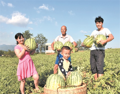 5月25日,游客在蓝山县土市镇泉塘村千亩西瓜园采摘早熟西瓜。该县把早熟西瓜作为推动乡村振兴的主导产业,按照“合作社+基地+大户”模式发展早熟西瓜1万余亩,吸引了众多游客上门体验采摘乐趣。杨雄春 雷渊进 摄