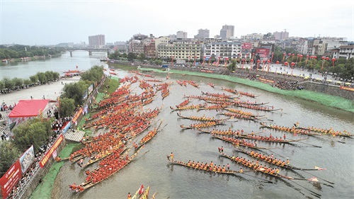 “五月五,龙船下水打烂鼓!”6月14日,道州龙船赛正式开幕,116艘龙船、3000余名运动员在潇水河上斩波激浪,演绎此项民俗文化精髓。道州龙船赛始于宋代,传承已有千年,是一项集民俗、健身、娱乐和竞技于一体的群众体育活动。2002年,道县被省政府授予“龙舟之乡”的称号;2006年,“道州龙船赛”被列入“湖南省首届非物质文化遗产代表名录”,目前,正积极申报国家级非物质文化遗产。 盘林 摄