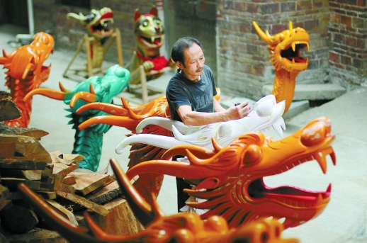 6月1日,道县濂溪街道东阳社区,雕刻木匠陈兵寿在打磨龙船的龙头。端午节临近,该县县城及周边临河的社区、村庄开始打造新龙船,迎接一年一度的端午节民间龙船大赛。道县龙船比赛是省级非物质文化遗产。何红福 摄