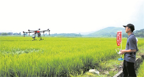 7月9日,宁远县天堂镇大阳洞村无人机操作手正在田间“驾机”施药。近年来,宁远县大力推广水稻机耕、机播、机插、机防、机收等全程机械化生产方式,助力乡村振兴,带动农民增收。今年该县水稻种植面积达50多万亩,在当地农机、电力部门的支持和保障下,种植环节95%以上实现了全程机械化。乐水旺 摄