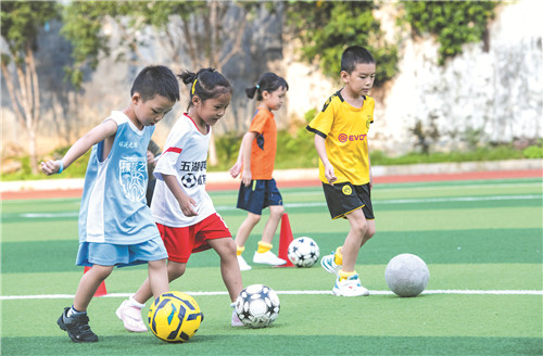7月14日,道县树湘学校运动场,孩子们在参加足球训练。暑假期间,道县许多热爱球类运动的孩子选择加入暑期篮球、足球等球类运动训练营,学习球类基本技巧,在运动中度过充实的假期。