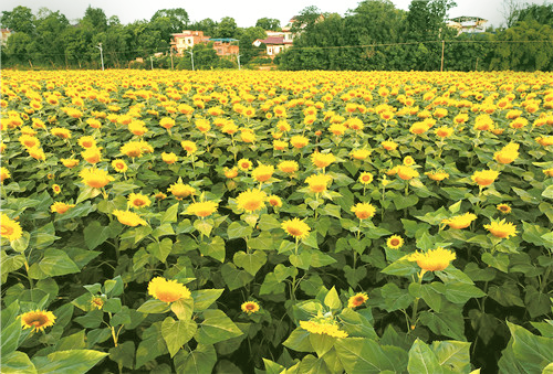 7月13日,东安县石期市镇蒋家村20余亩向日葵花开正盛,将田野装扮成金色的海洋,如诗如画的田园美景吸引众多市民前来游玩。近年来,该村积极发展特色种植业,带动周边农户增收,成为乡村振兴的重要抓手。 永州日报记者 郭磊 摄