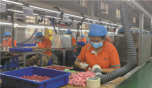 8月10日,湖南泰乐潮玩有限公司厂房里,工人们正在全力赶制生产订单,公司拥有高度一体化制作工艺及机械设备,可实现年产1000万只手办潮玩玩具。永州日报记者 李丽 摄