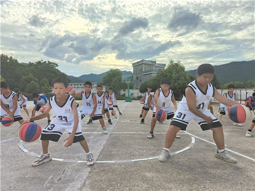 连日来,在宁远县中和镇慕投村的篮球场上,村里40余名少年儿童免费参加培训。图为孩子们在教练的指导下正在练习运球、控球、投篮等基础技巧。 骆力军 摄