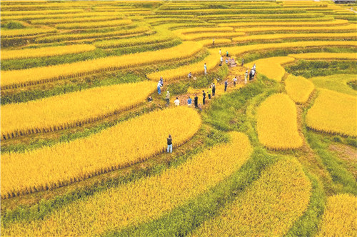 9月4日,东安舜皇山国家森林公园管理局塘家梯田,村民们开镰收割。层层叠叠的梯田,金色稻浪翻滚,与劳作的村民构成了一幅秋收风景。近年来,东安县实施“生态+旅游”“农业+旅游”融合发展战略,加强塘家梯田的保护与开发,全力打造原生态田园风光。 严洁 摄
