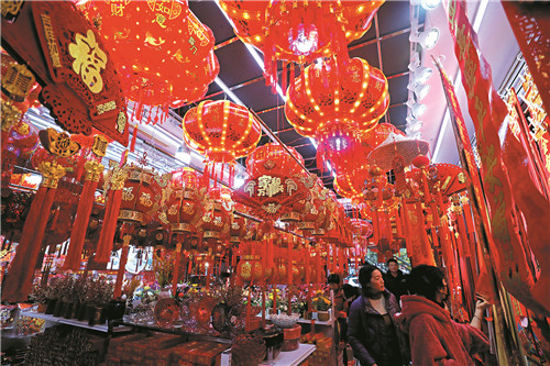 1月31日,顾客在冷水滩区桥头市场选购节日饰品。龙年春节临近,喜庆年味渐浓,中心城区各商贸点的节日饰品购销两旺,春联、灯笼、龙年挂饰、中国结等受到顾客青睐。永州日报记者 郭磊 摄