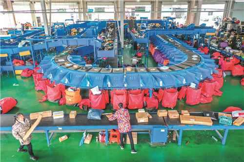 1月30日,蓝山县创品国际智慧物流园,工作人员在智能分拣作业线上忙碌。临近年关,年货寄递进入高峰期,该县快递物流企业纷纷开足马力,通过增派人手、增强运力,利用智能分拣设备,提高快递揽收和配送时效, 全力保障春节前年货寄递需求。彭华 摄