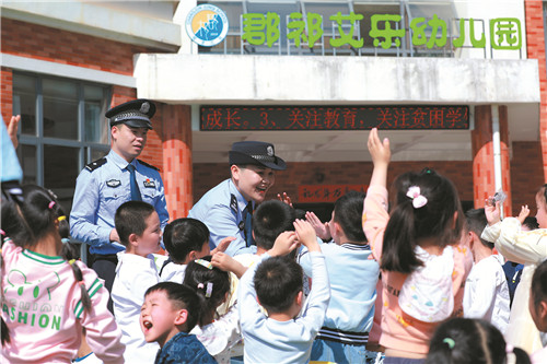近日,祁阳市公安局民警走进辖区中小学校、幼儿园,宣讲防拐、防校园欺凌、防火等知识。在互动讲解环节,孩子们踊跃参加安全防范知识有奖问答,获得了小礼品。 李会生 摄