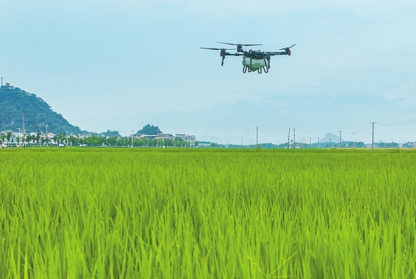 8月20日,道县原地正禾农场,无人机在进行“飞防”作业。临近处暑,当地农民抢抓农时,有序开展秋收、秋种、秋管等农事活动。 蒋克青 摄