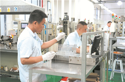 9月9日,位于永州经开区工业园内的永州维尔利电子有限公司技术工人正在赶制光电子器件订单。近年来,该区把磁性电子元器件作为全区的首位产业,目前已发展聚集了锦络电子、唯特电子、宇特电子、顺络电子等26家磁性电子元器件企业,力争打造成华南地区最大磁性电子元器件产业集群。永州日报记者 柏俊林 摄