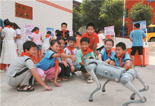 9月10日,新田县三井学校,学生在与机器狗互动。当天,县科协邀请市科普大篷车到该县开展“科普进校园”活动,通过组织学生参观科普展板、体验科普仪器等活动,让孩子们近距离感受科技的魅力,激发他们创新创造意识和科学探索精神。 刘贵雄 摄