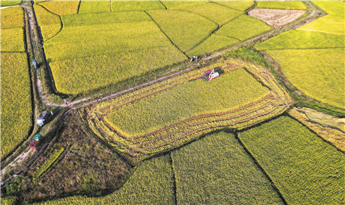 近日,新田县新圩镇上禾塘村村民驾驶收割机在田间收获晚稻。金秋时节,新田县晚稻陆续成熟迎来丰收季,当地农民抢抓晴好天气开展收割作业,确保粮食颗粒归仓。刘贵雄 摄