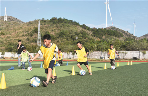10月10日,江永县松柏瑶族乡黄甲岭学校的小学生们在足球场上进行足球技能训练。近年来,该县推动校园体育活动“加时”“加量”,通过丰富体育课程、成立体育兴趣小组和社团等举措,激发学生参与体育锻炼的热情。 田如瑞 摄