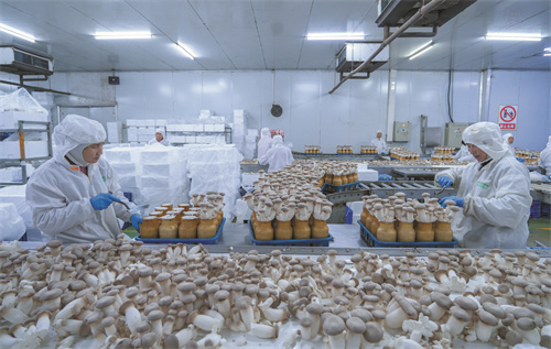 12月16日,冷水滩区湖南省宇秀生物科技有限公司杏鲍菇生产基地,工人在采收杏鲍菇。该基地日产杏鲍菇30余吨,产品主要出口欧美和东南亚地区,年产值1亿多元。雷中祥 曹慧璎 摄
