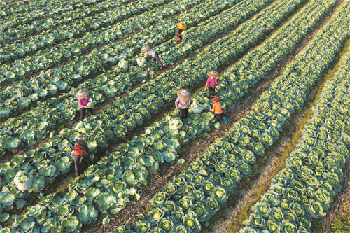 3月14日,道县四马桥镇昌瑞瑶寨蔬菜种植基地,农户在采收包菜。近年来,道县大力发展外向型蔬菜产业,实行蔬菜四季轮作,产品直供粤港澳大湾区市场,有效带动村民增收致富。 蒋克青 摄