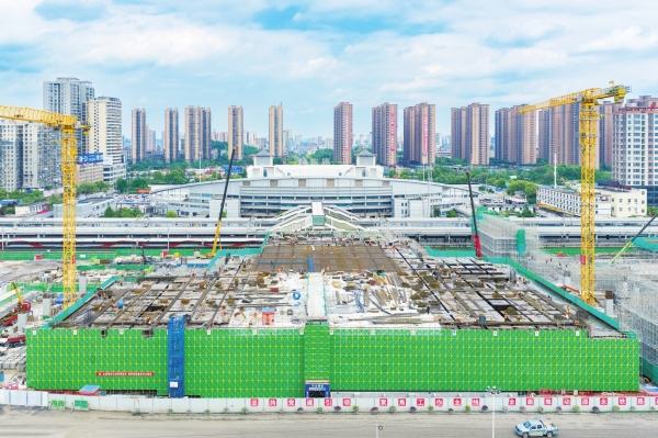 4月23日,邵永铁路永州站改造工程建设项目高架候车厅主体结构施工现场。永州站改造工程是邵永高铁关键控制性项目,建成后永州站将成为集邵永高铁、衡柳铁路及规划中广清永高铁于一体的综合性交通枢纽,打通湘南地区对接粤港澳大湾区的高铁瓶颈。 雷中祥 蒋凌志 摄影报道