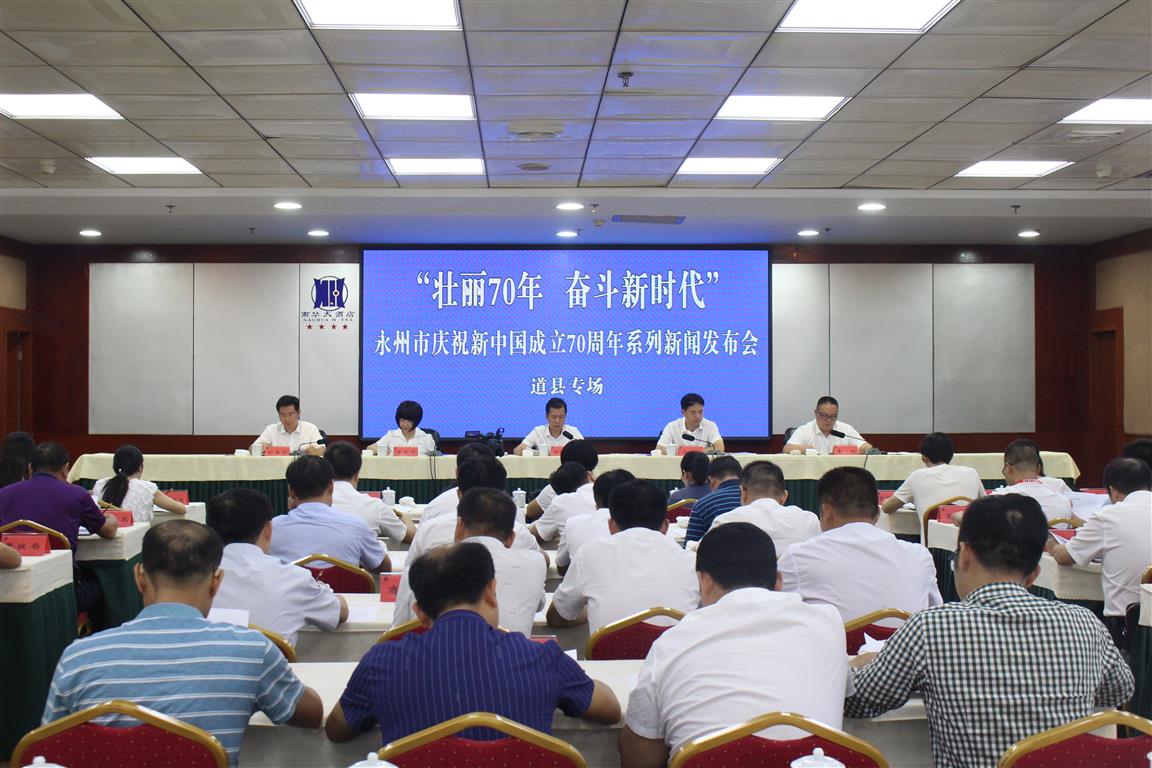 永州新闻网讯(记者 谢思佳 何宇翔 安月)9月9日上午,永州市“壮丽70年·奋斗新时代”系列新闻发布会举行道县专场,展示70年来道县经济社会发展情况。道县县委书记吴恢才发布新闻。道县县委副书记蒋燕飞,道县县委常委、常务副县长李林,道县县委常委、宣传部长彭德源分别就脱贫攻坚、项目建设、红色文化等问题答记者问。