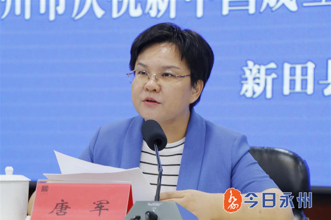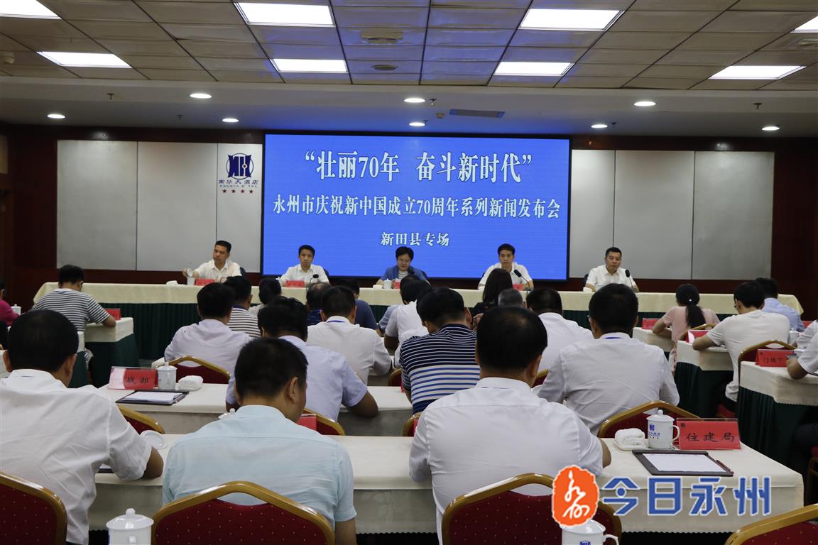 永州新闻网讯(记者 谢思佳 彭丽霞 杨永玲)9月16日上午,永州市“壮丽70年·奋斗新时代”系列新闻发布会举行新田县专场,展示70年来新田县经济社会发展情况。新田县委书记唐军发布新闻,并与新田县委副书记、县长秦山成,新田县委常委、常务副县长王名扬,副县长刘大兵分别就新田县经济产业发展、民生改善、脱贫攻坚、经济社会发展等问题答记者问。