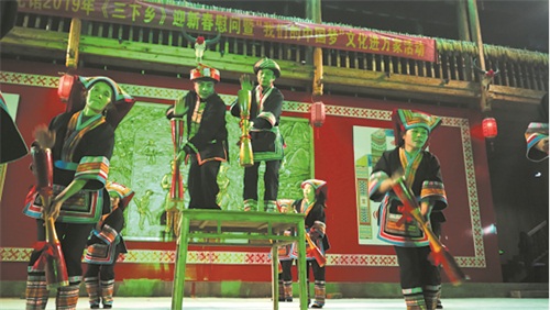 永州日报讯(通讯员 唐世日 陈永祥 蒋天平) “贝贝积凤彩云乖,非崩切免淘一拽(瑶语意译:百鸟朝凤彩云开,远方客人到瑶寨)……”1月25日晚上7点30分,一阵阵音韵优美、激昂清越、节奏明快的瑶歌《敬酒歌》在湖南省江华瑶族自治县湘江乡桐冲口村上空回荡。2019年文化志愿者送戏下乡桐冲口村春晚拉开帷幕。