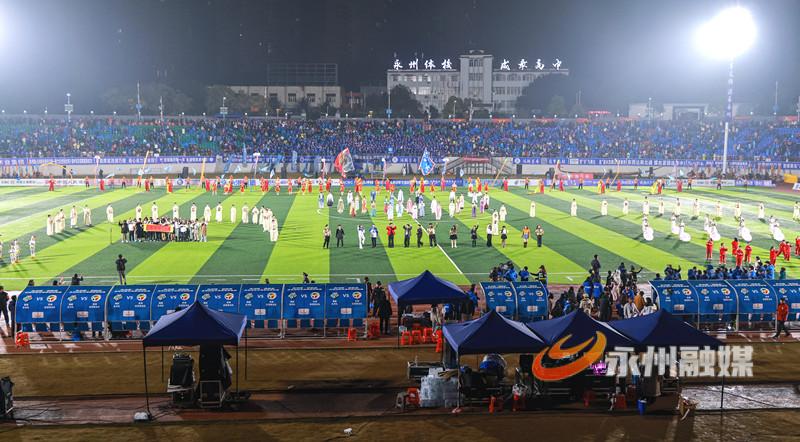 为了答谢全市人民和所有关心支持湘超永州队的朋友,永州市委、市政府精心组织了这台“足球春晚”。18时40分,湘超冠军永州队队员与感动全网的“第12人”代表、全市各县市区代表、江苏“十三太保”代表,和退伍军人、外来务工人员、劳模代表一起,乘坐冠军巡游花车驶入体育场,现场掌声呐喊声雷动,全场近2万人合唱《真心英雄》,拉开了“足球春晚”帷幕。