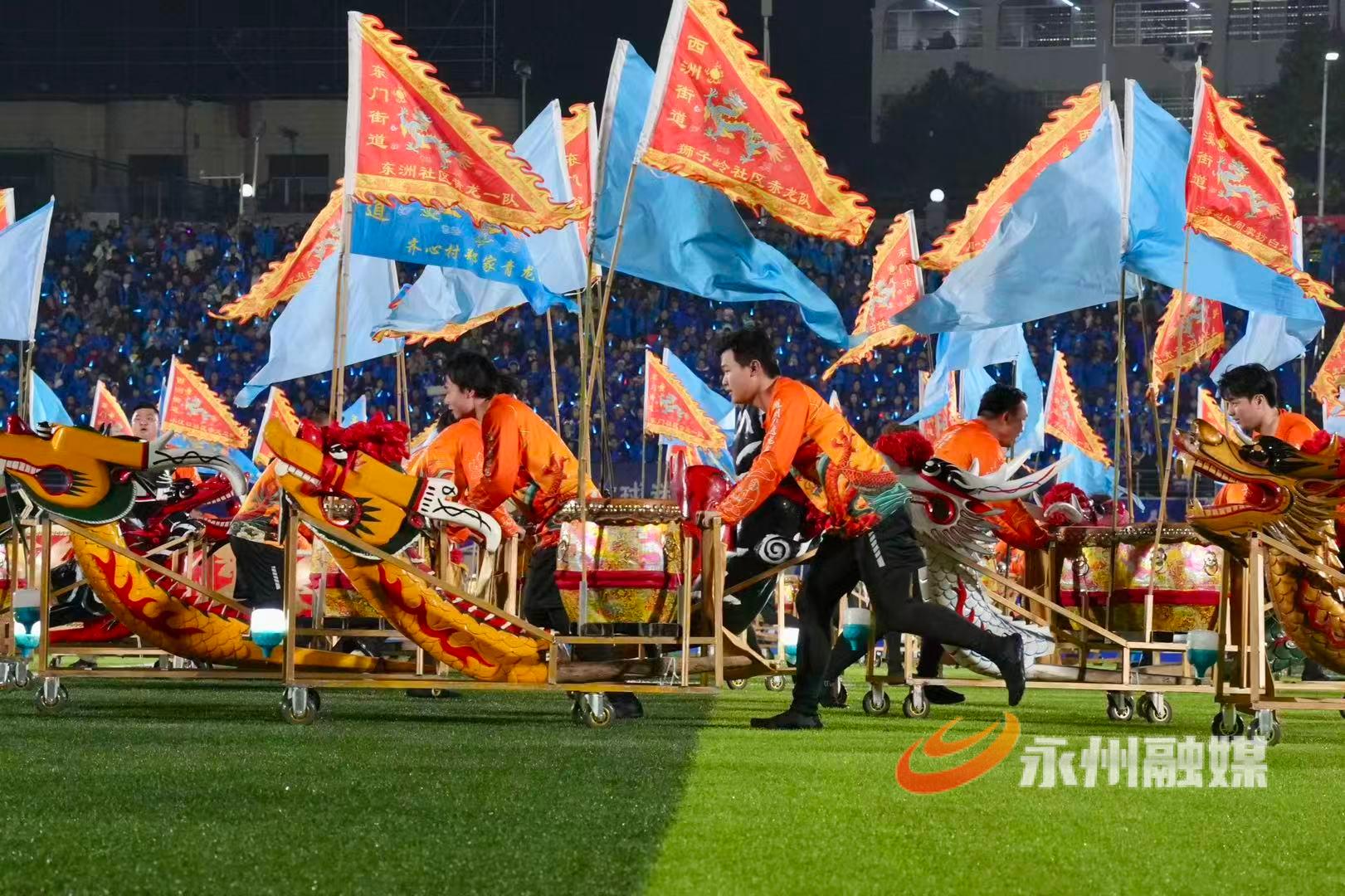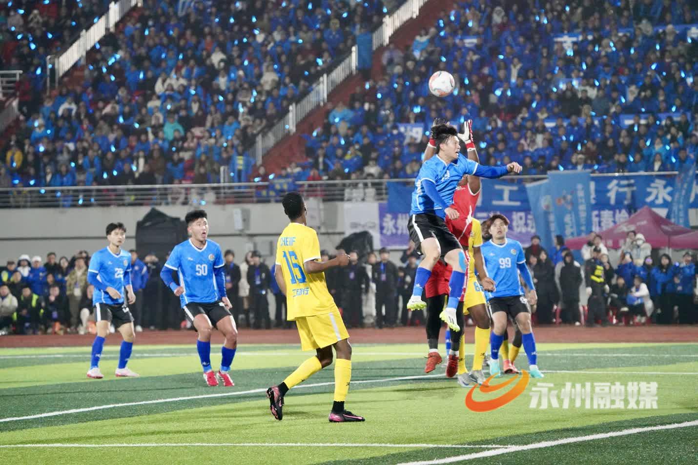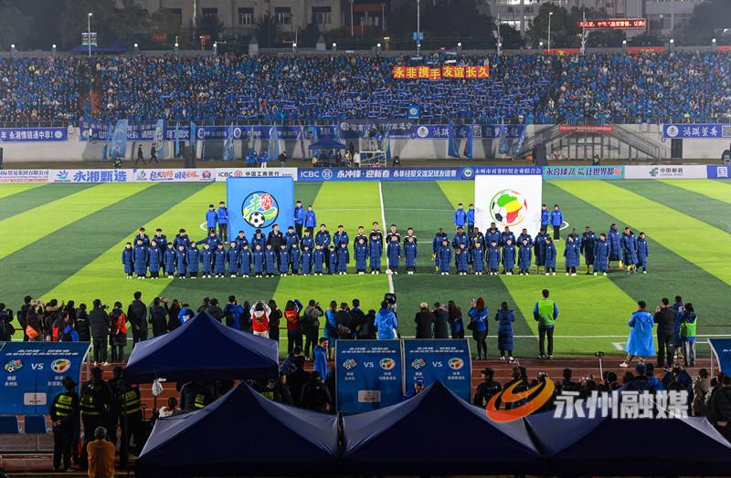 湘超赞助商代表、“央超”球员代表、外地球迷代表、海内外永州人也向晚会发来拜年视频。与永州有经贸合作关系的非洲国家友人带来奔放热烈的鼓舞节目《燃情非洲》,展示了质朴的热情与力量。随后,永州健儿与非洲友人展开了一场精彩的永非经贸交流足球友谊赛。非洲足球队员来自几内亚、多哥、尼日利亚等19个国家,包括7名参加过非洲国家杯(AFCON)及非洲国家锦标赛(CHAN)的国脚。经过激烈角逐,永州队在最后一刻追平比分,双方2比2战平。球赛结束后,晚会在温馨的《相亲相爱一家人》全场互动歌舞中落下帷幕。
