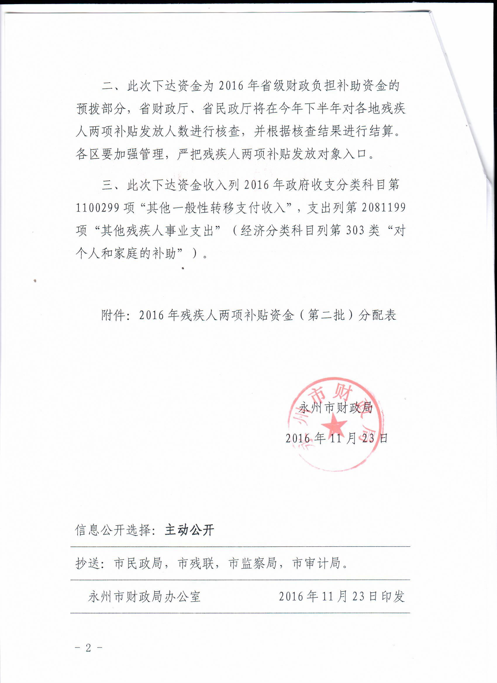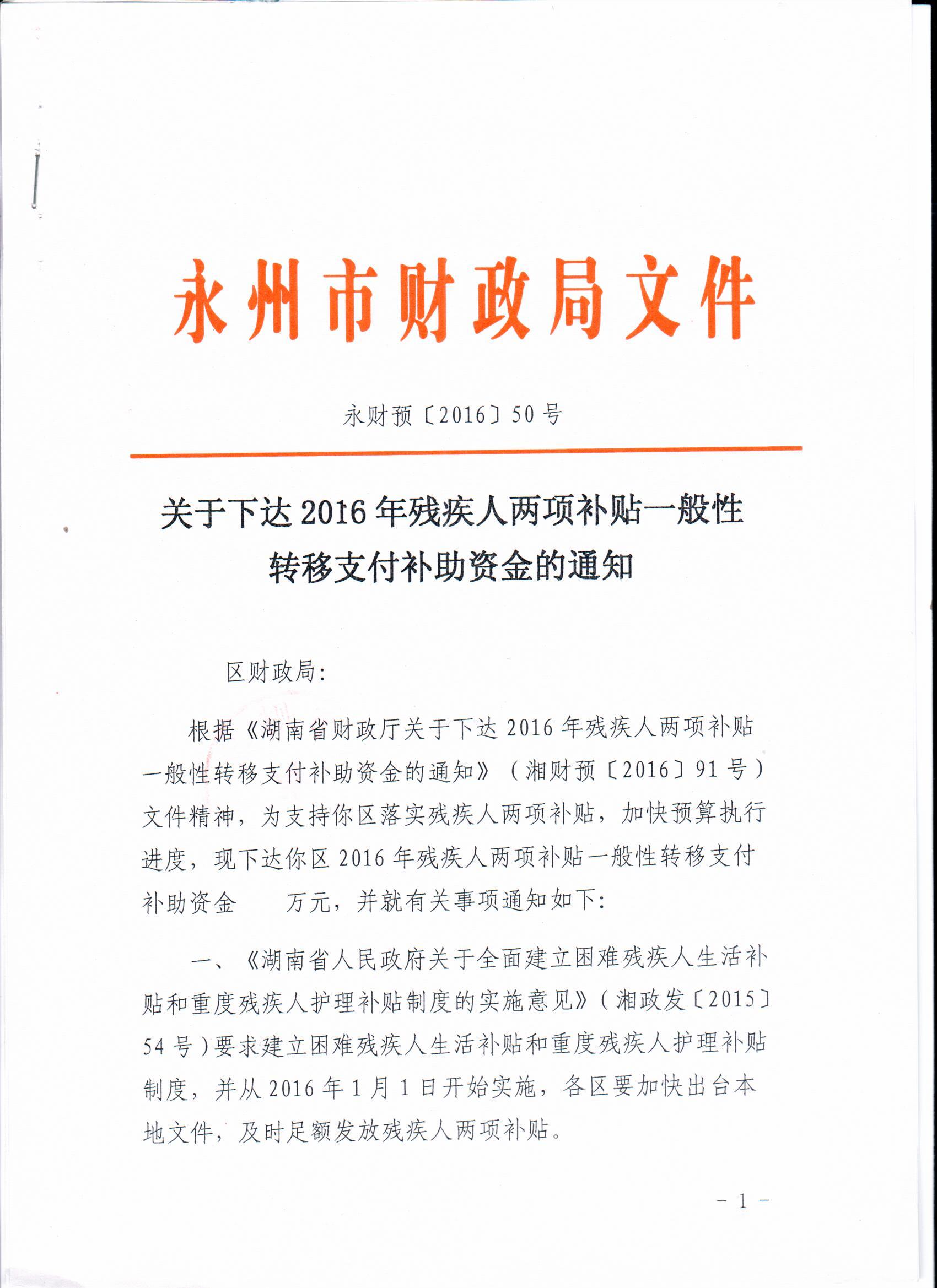 关于下达2016年残疾人两项补贴一般性转移支付补助资金的通知