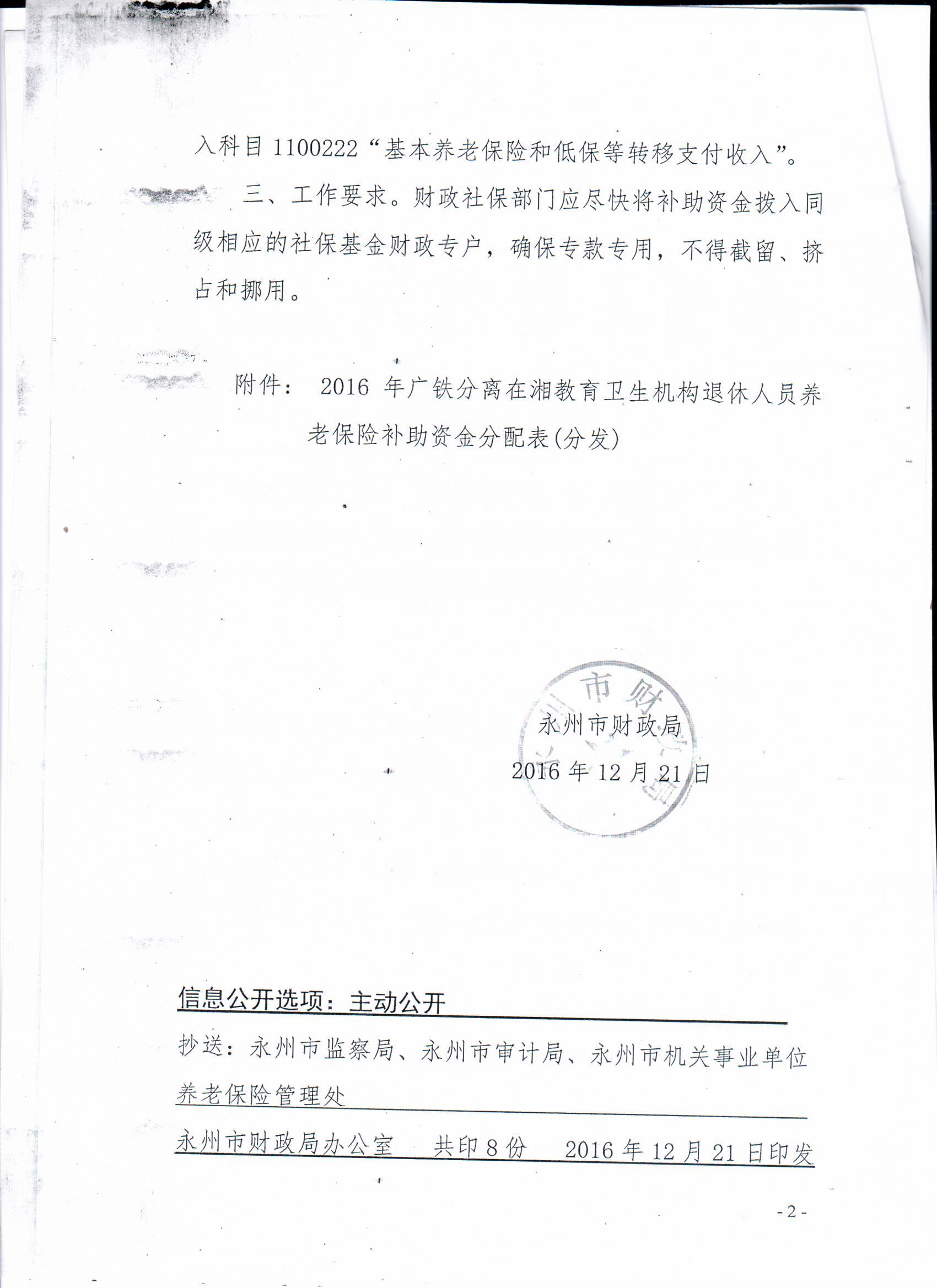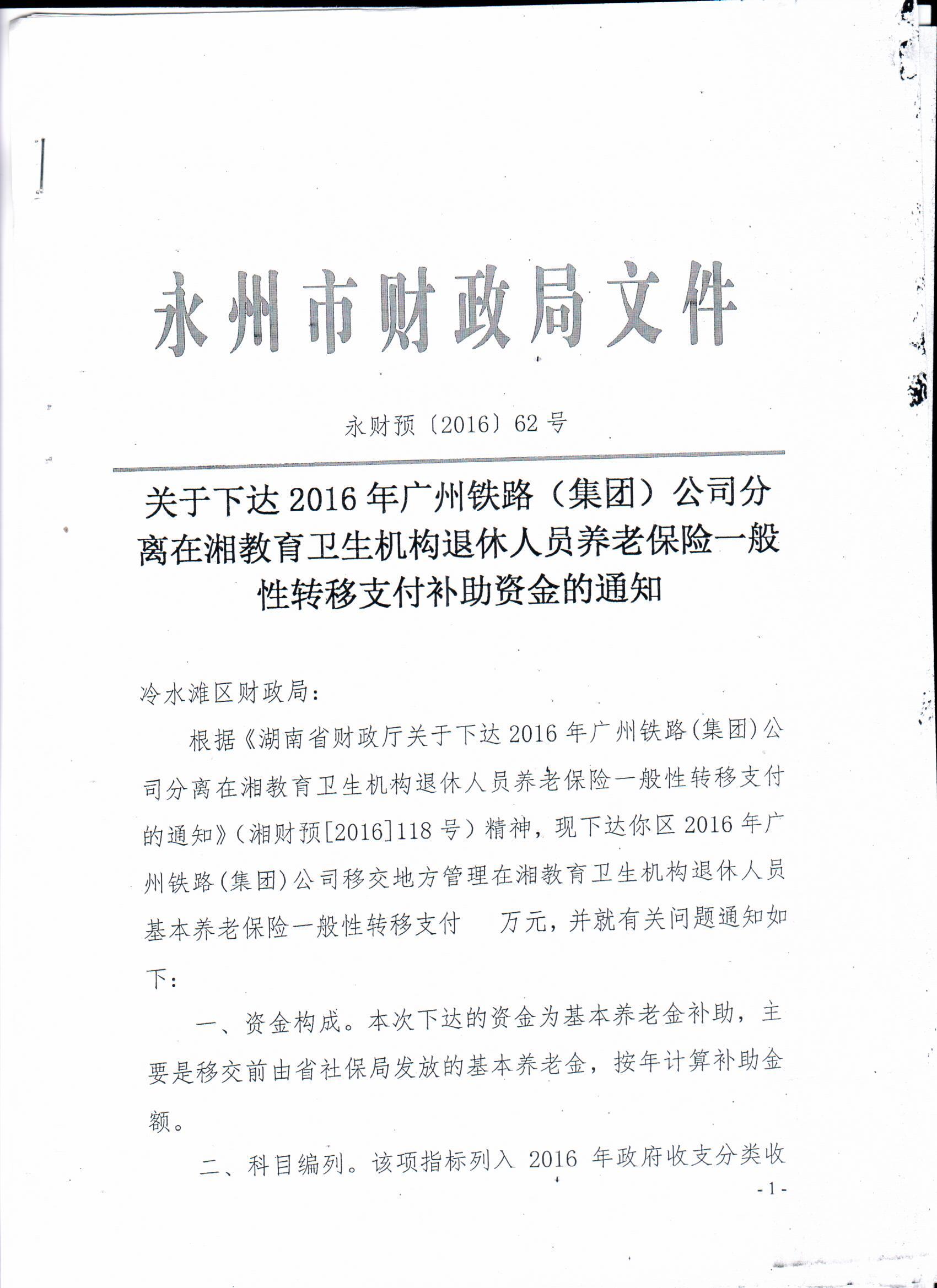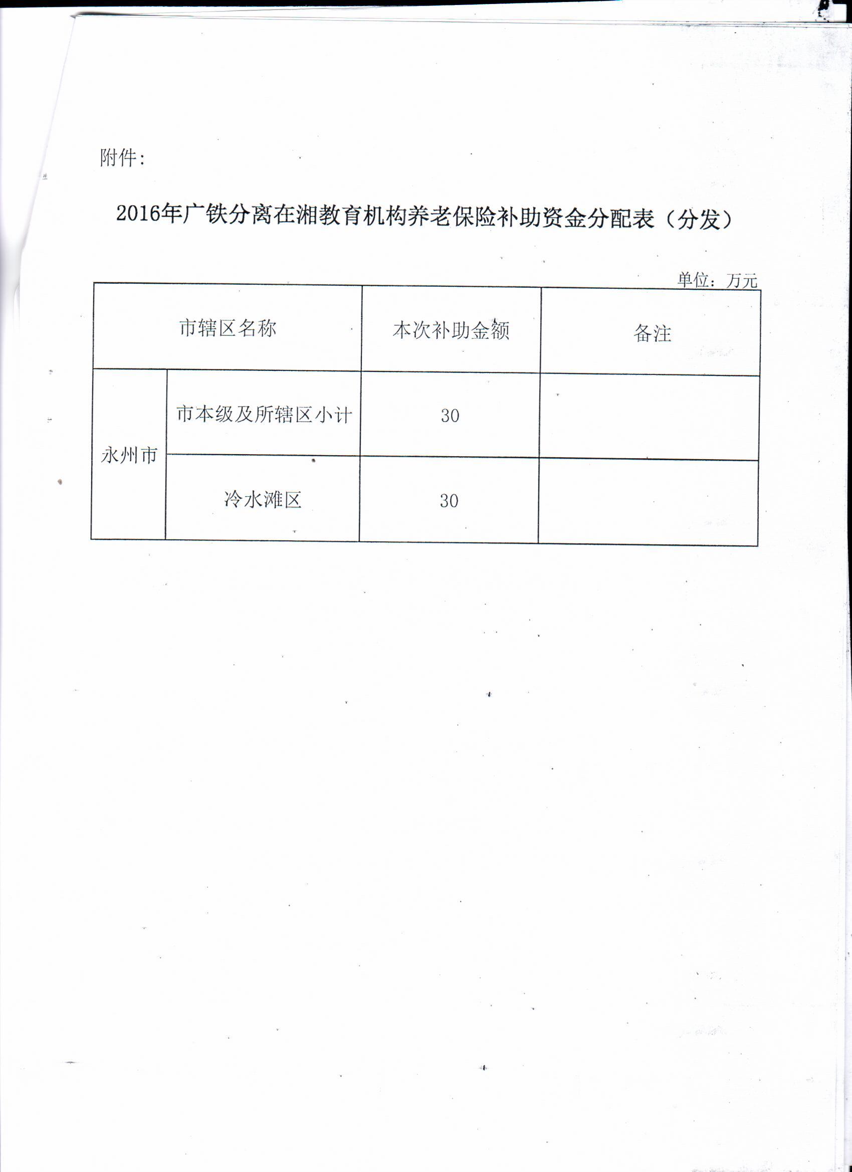 关于下达2016年广州铁路(集团)公司分离在湘教育卫生机构退休人员养老保险一般性转移支付补助资金的通知