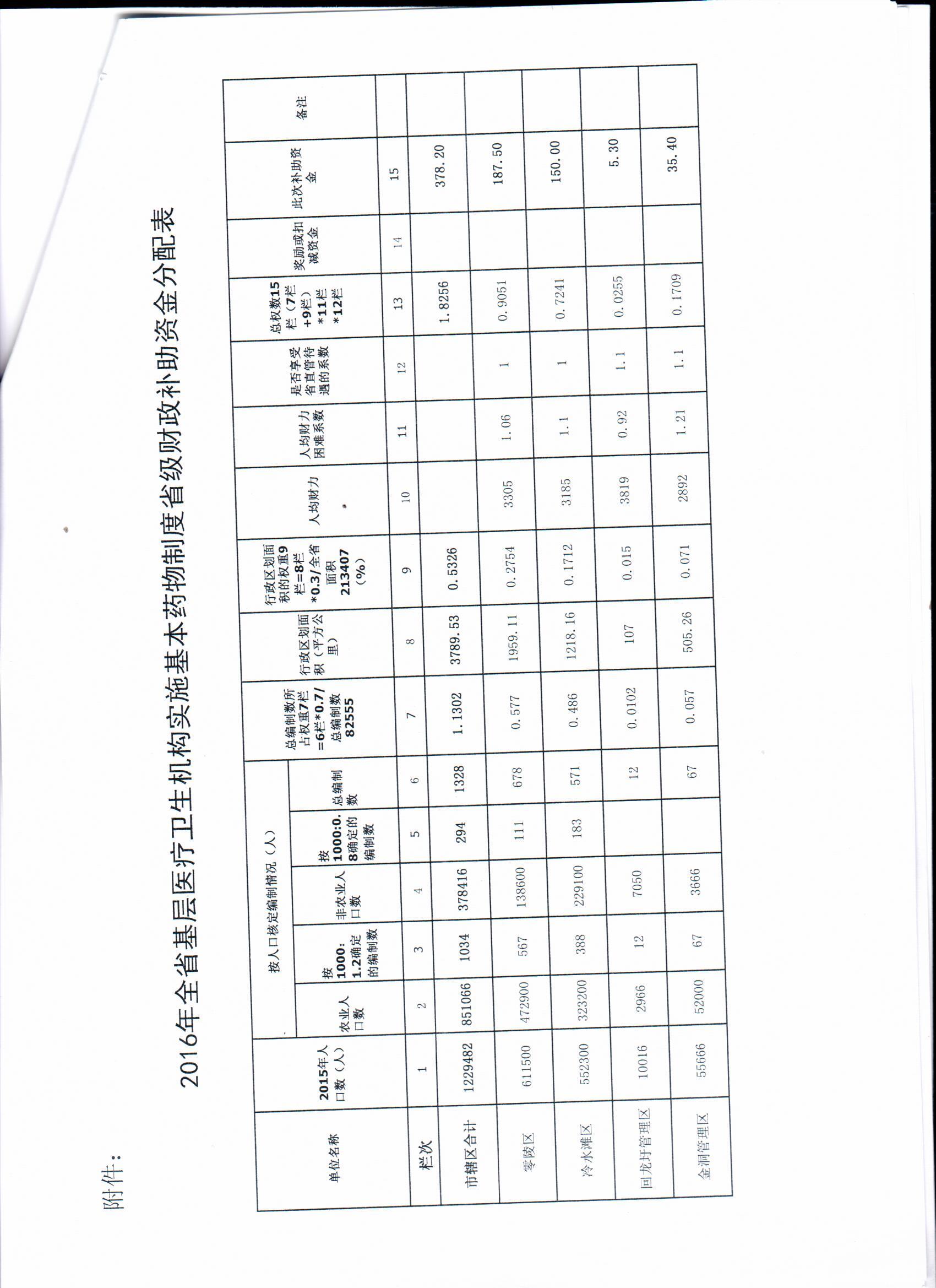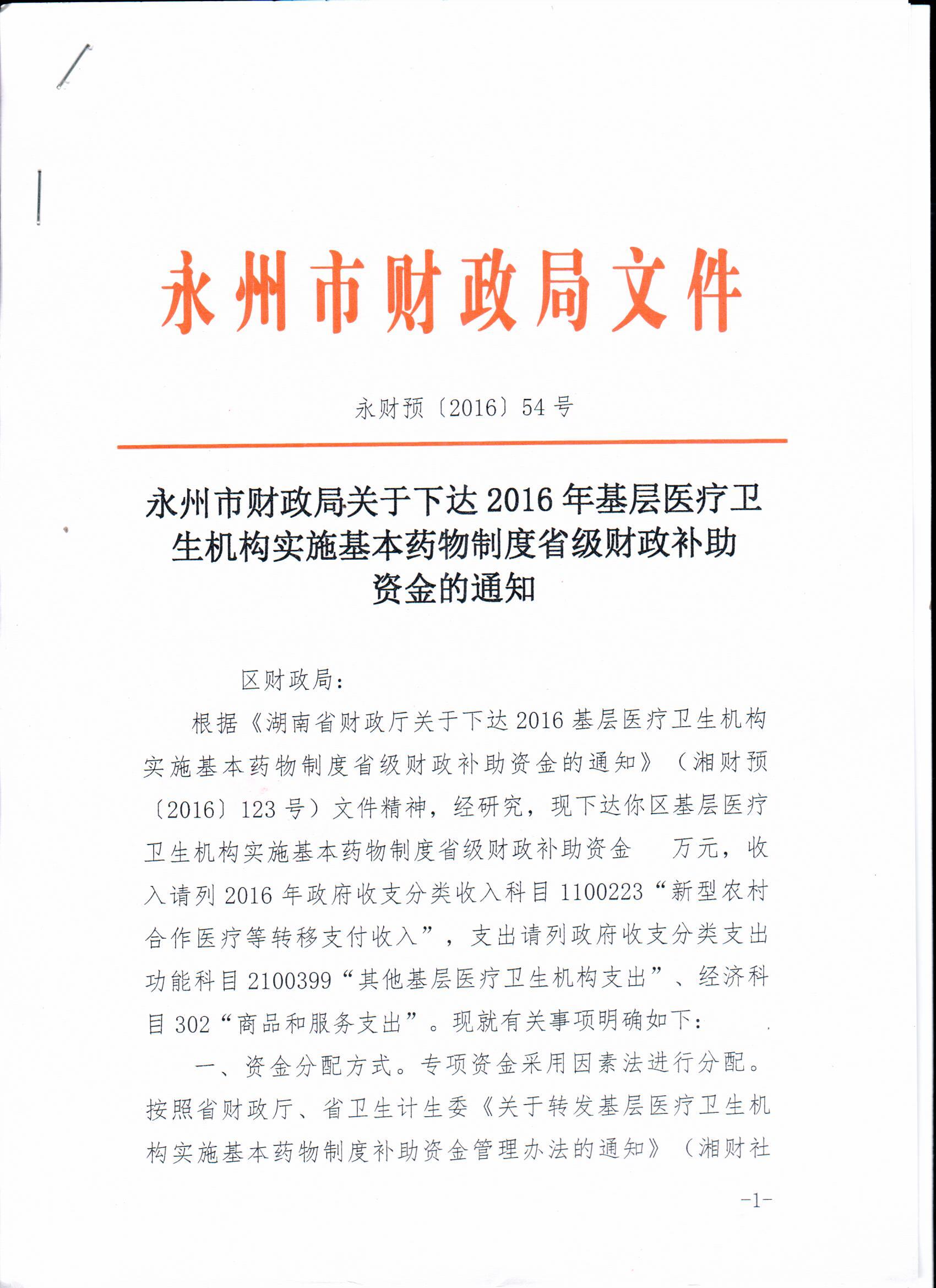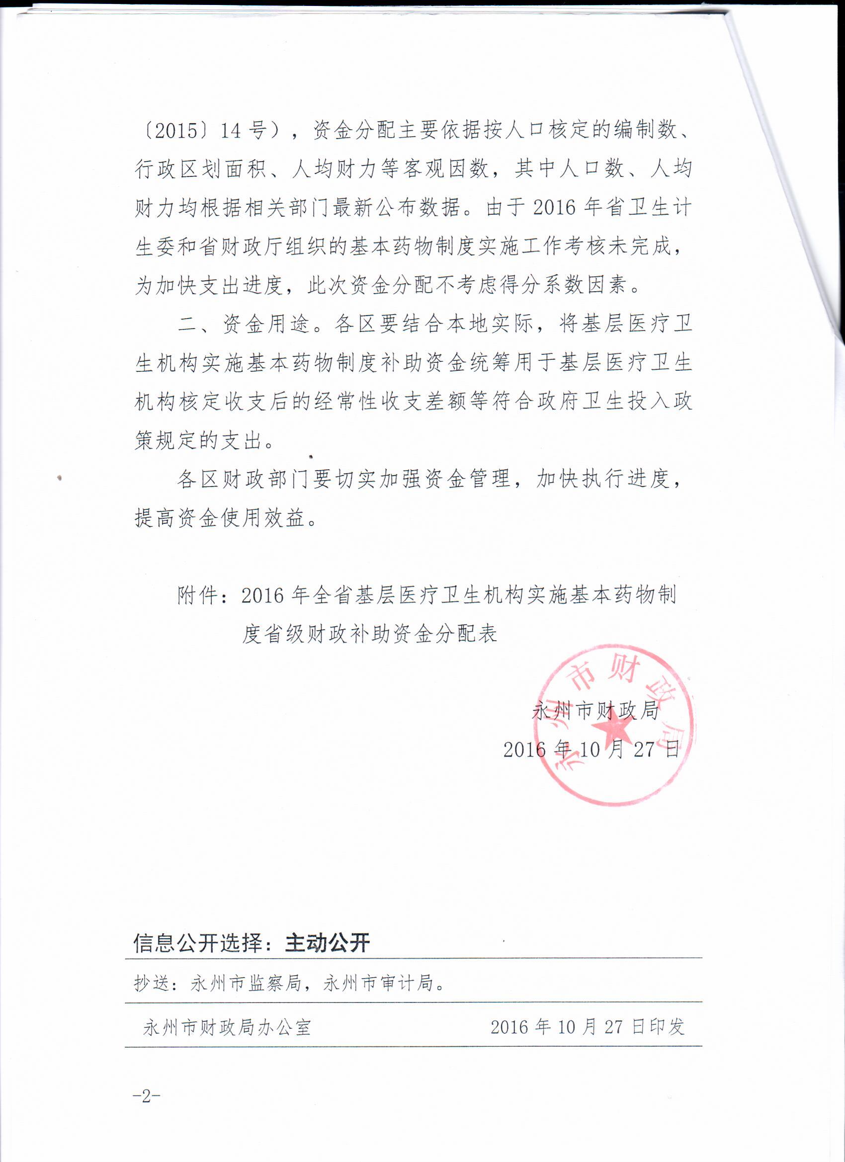 永州市财政局关于下达2016年基层医疗卫生机构实施基本药物制度省级财政补助资金的通知