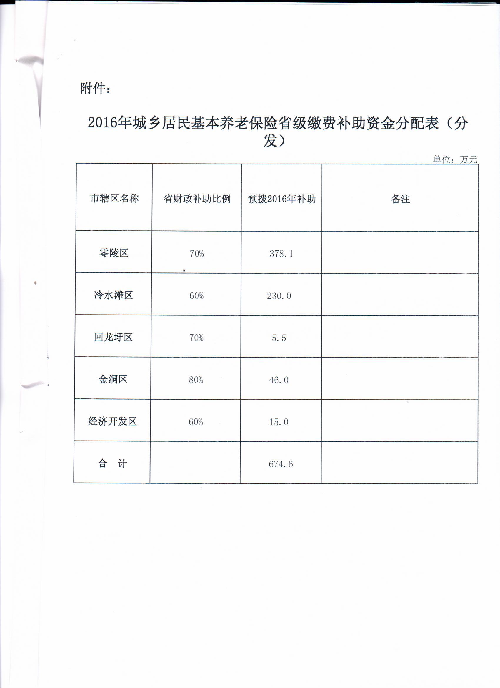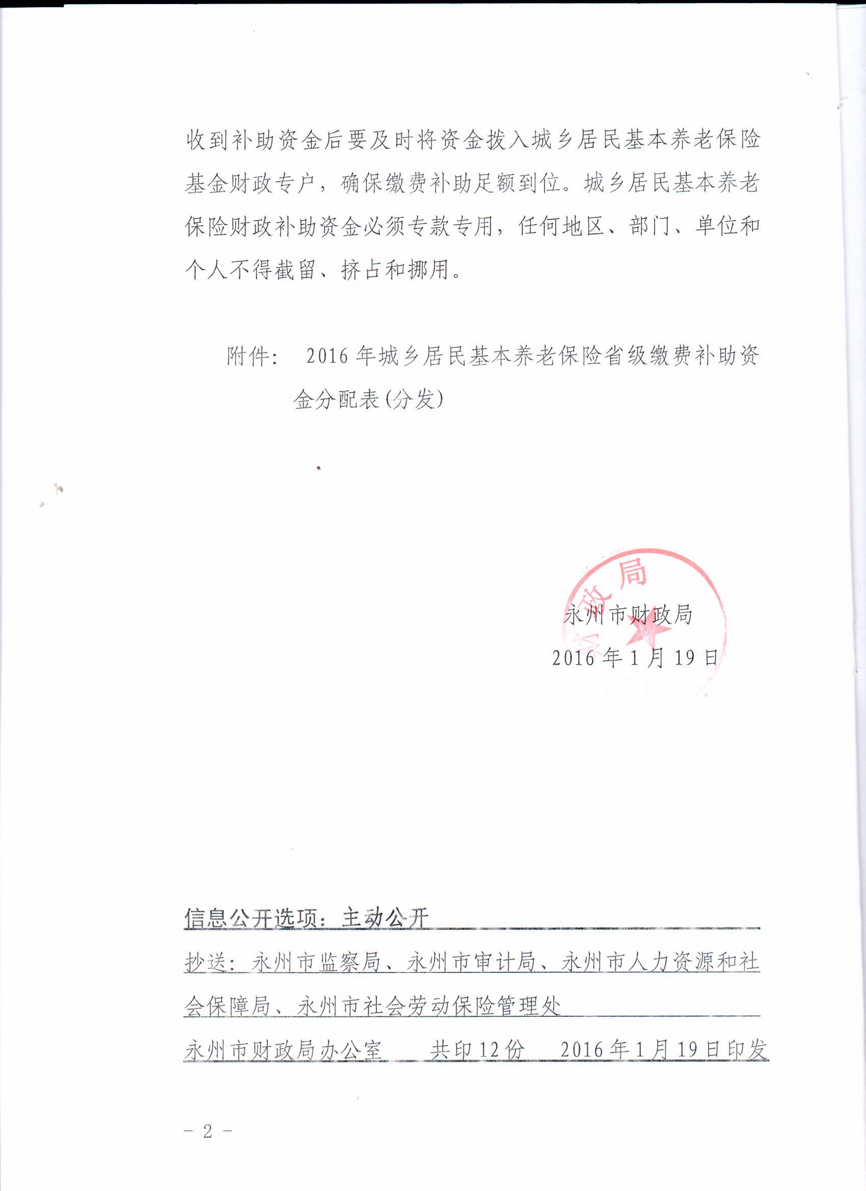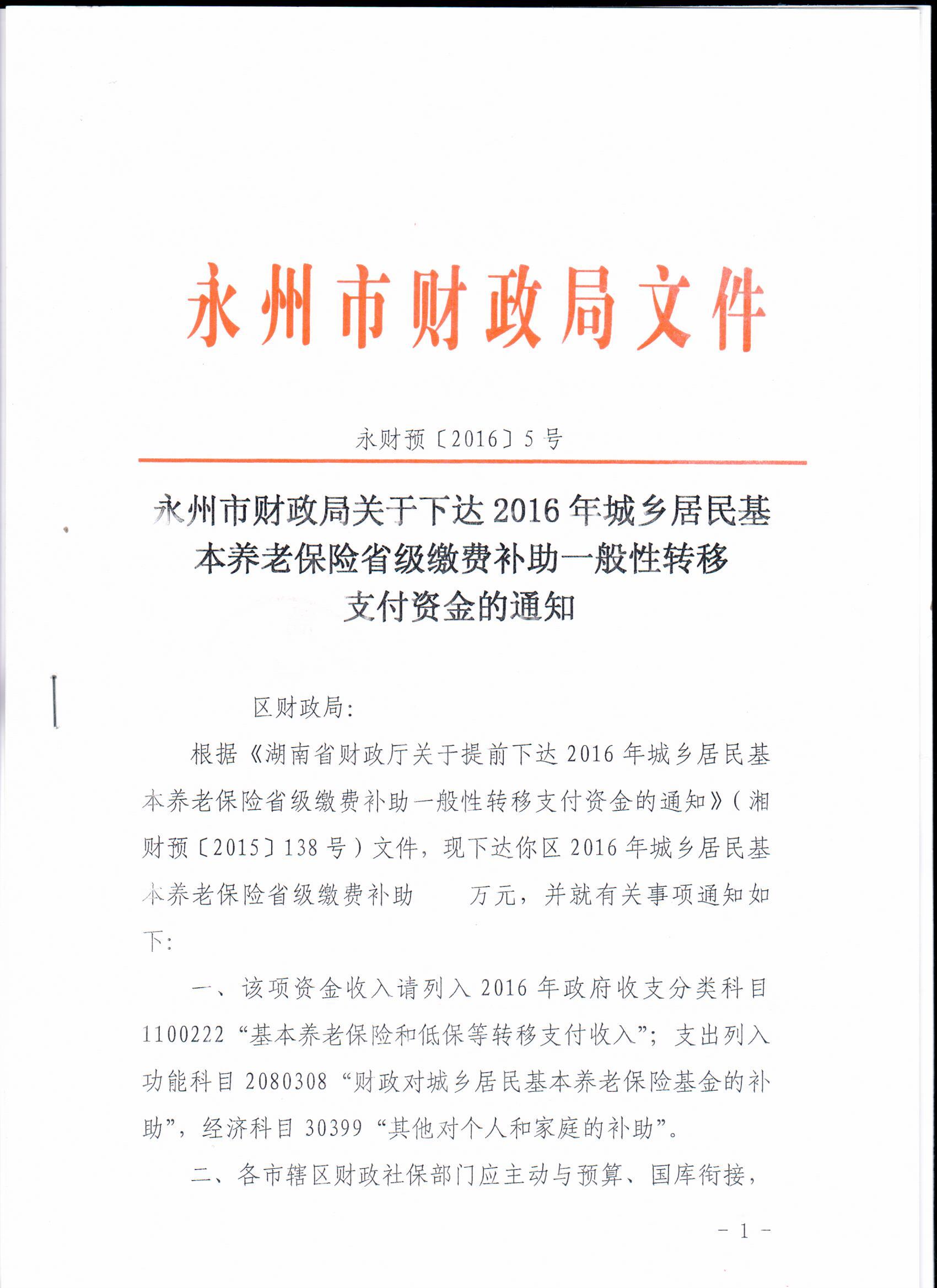 永州市财政局关于下达2016年城乡居民基本养老保险省级缴费补助一般性转移支付资金的通知