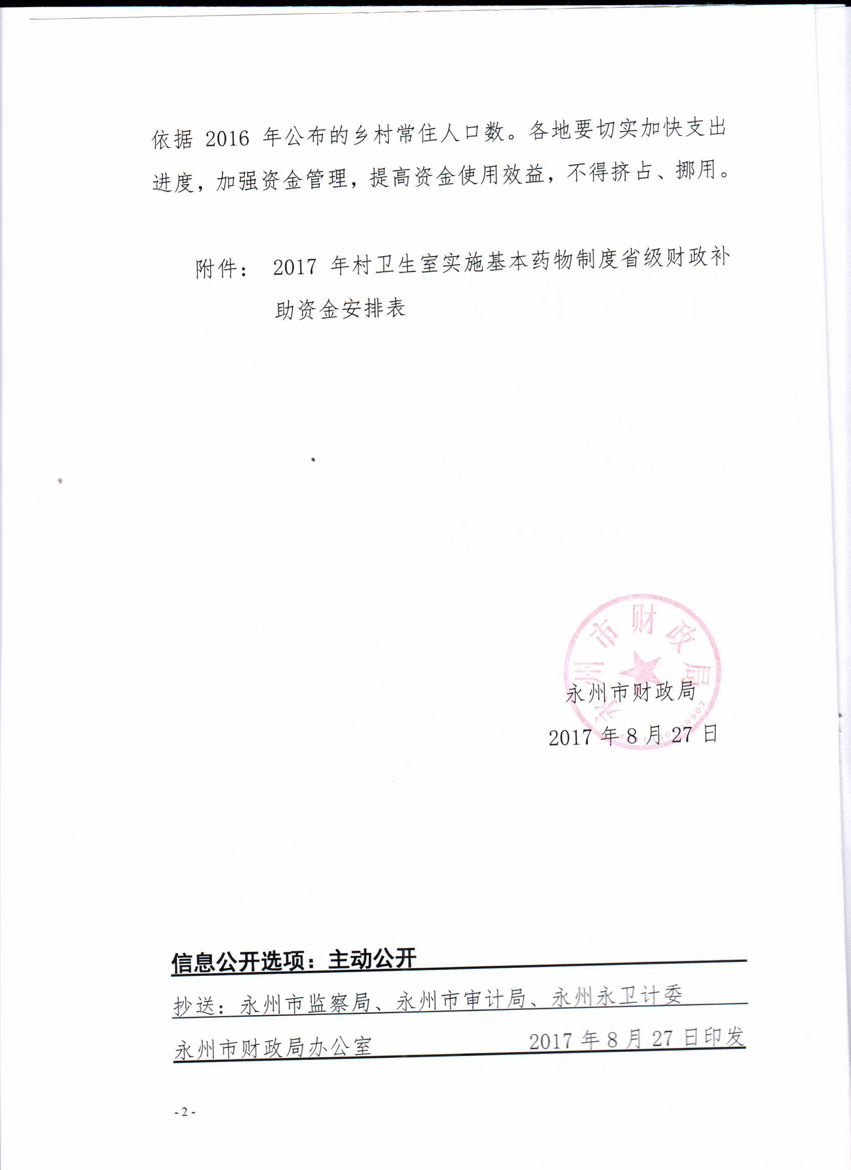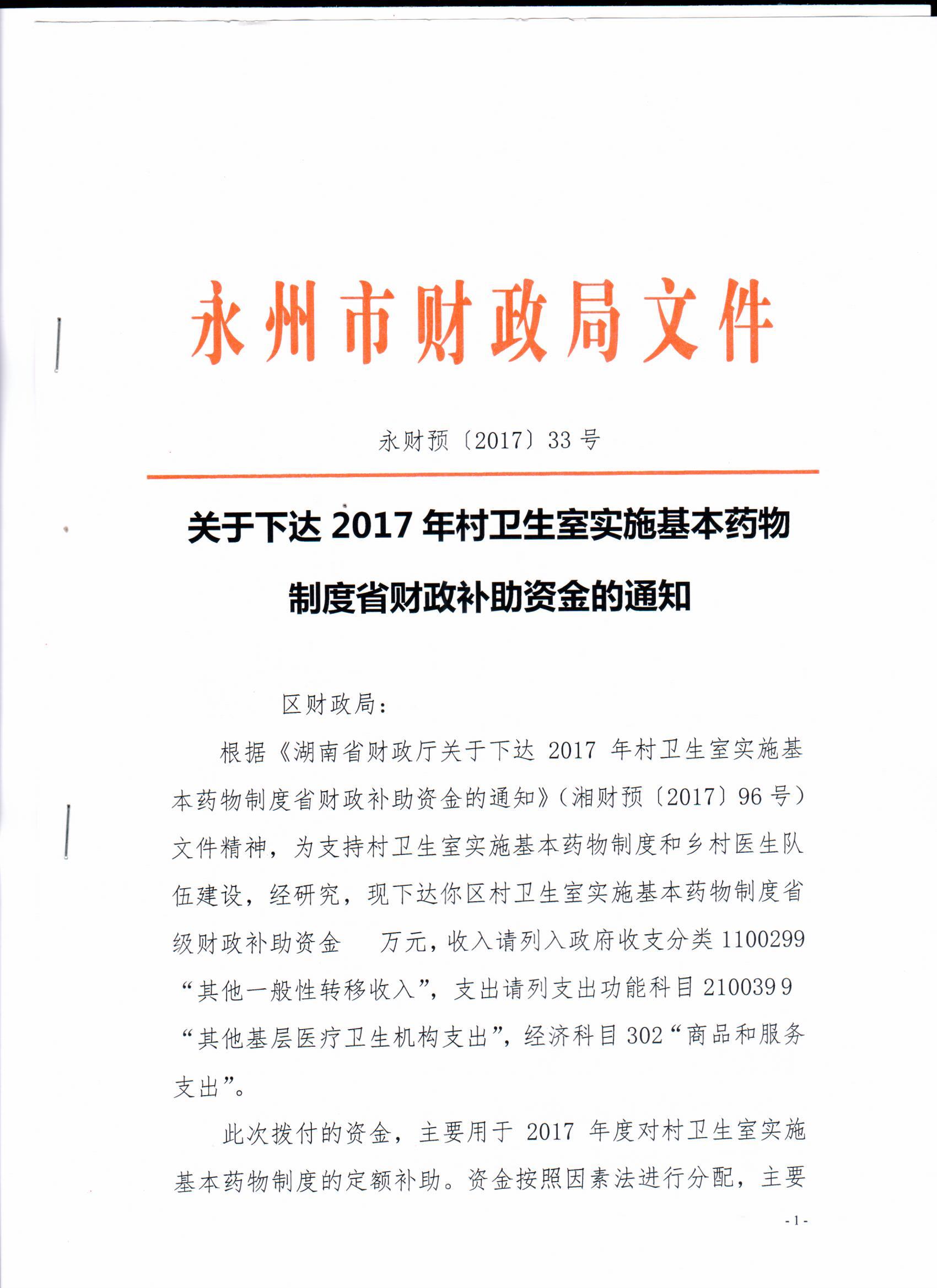 关于下达2017年村卫生室实施基本药物制度省财政补助资金的通知