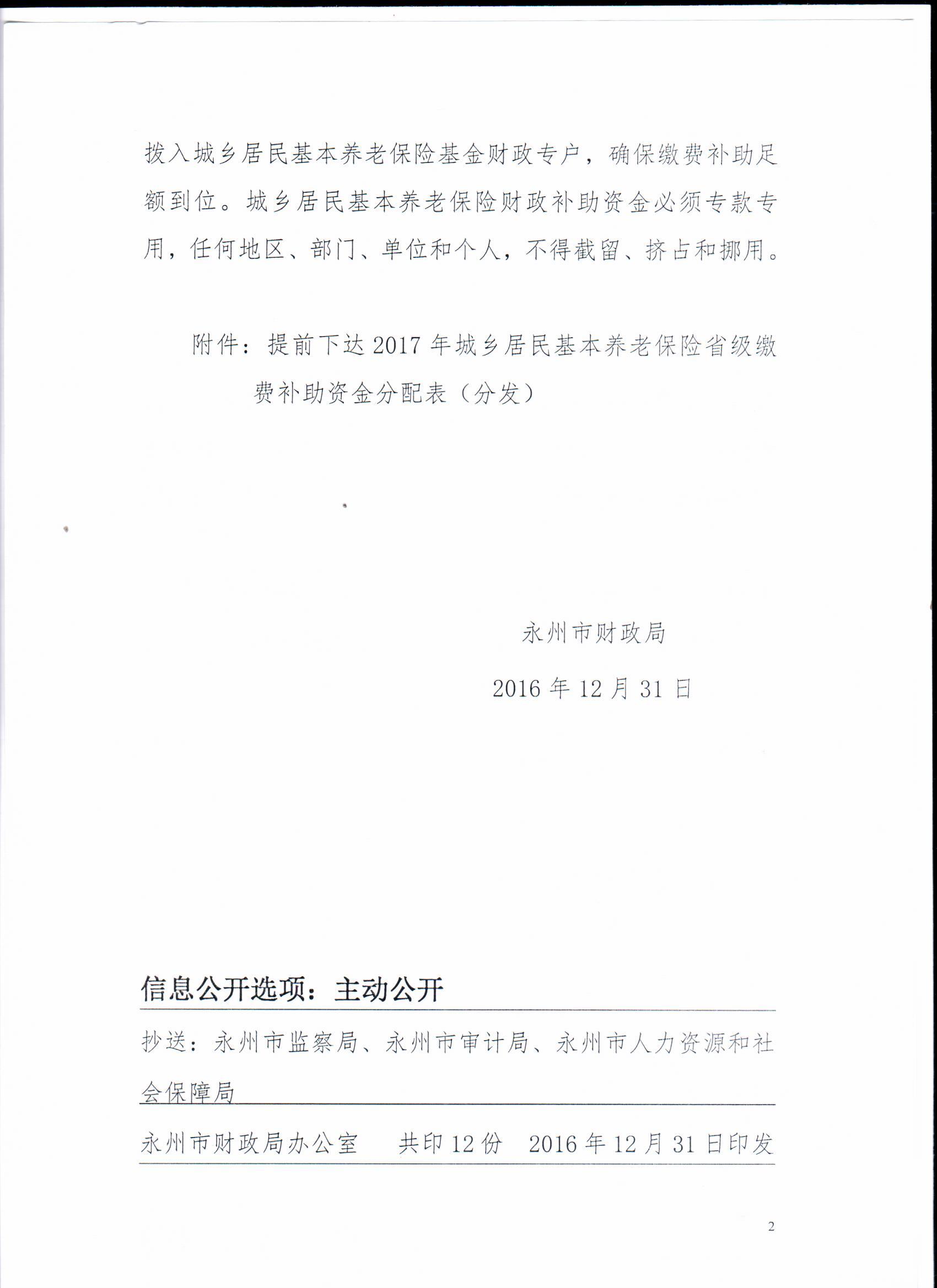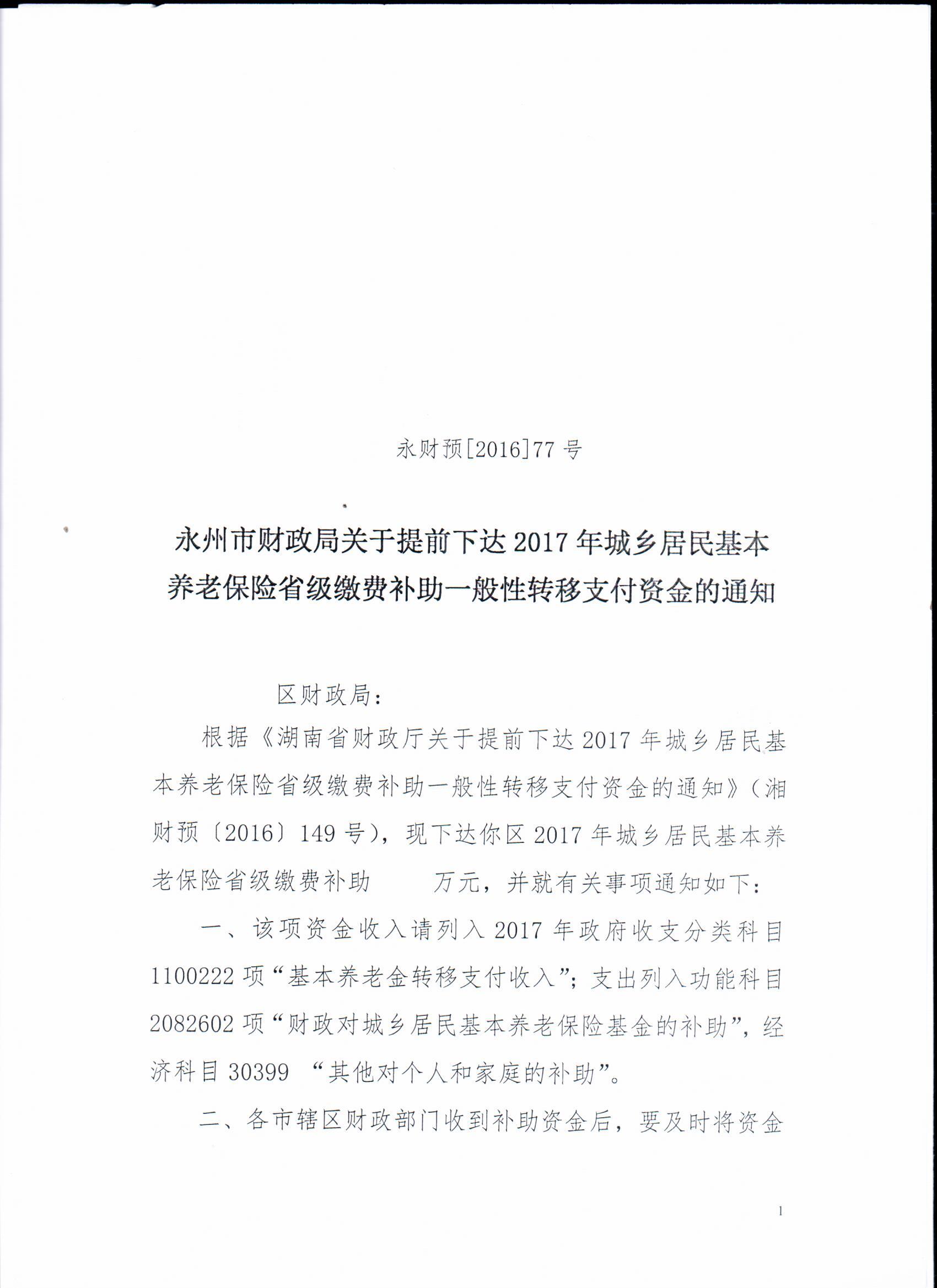 永州市财政局关于提前下达2017年城乡居民基本养老保险省级缴费补助一般性转移支付资金的通知