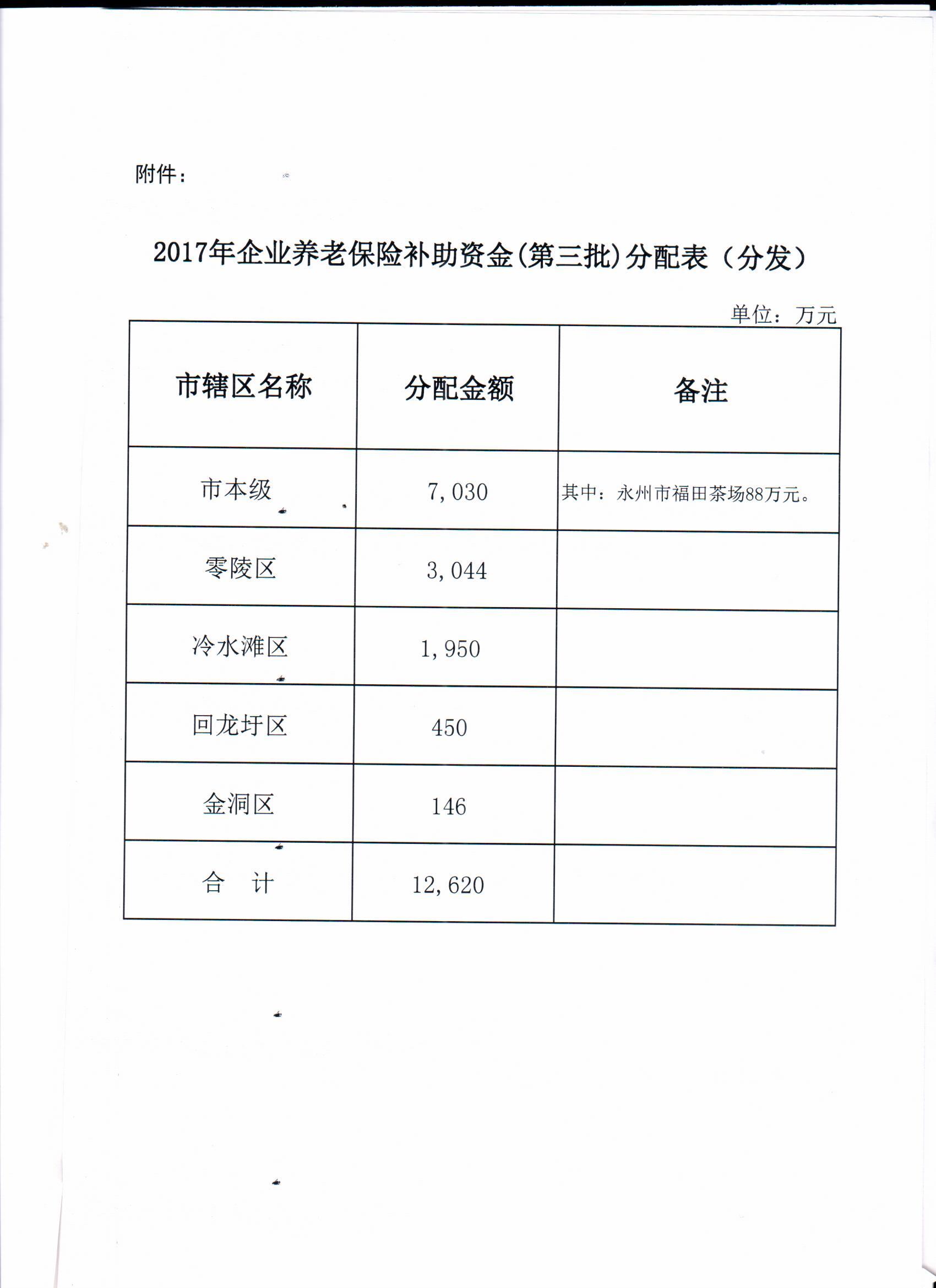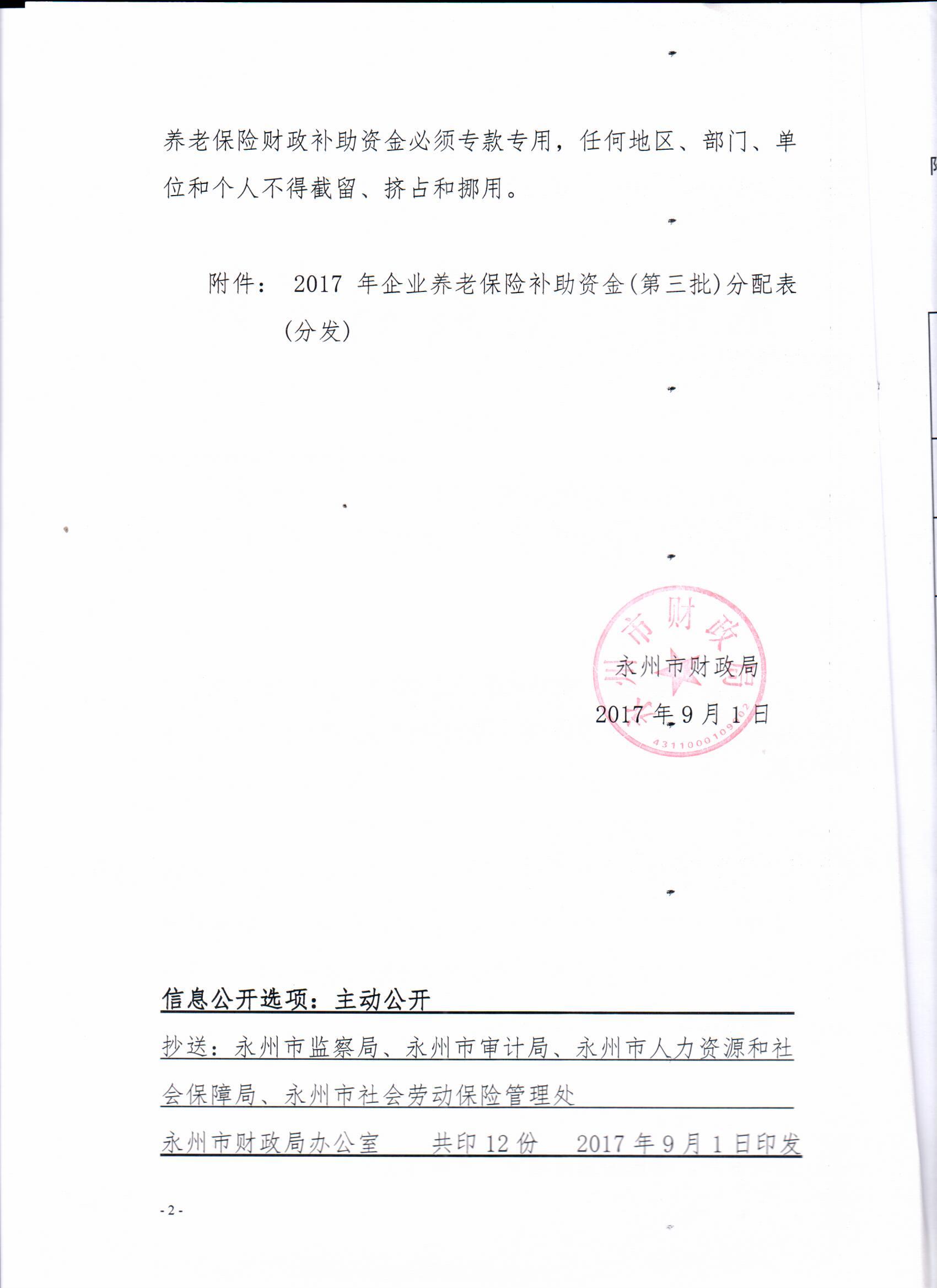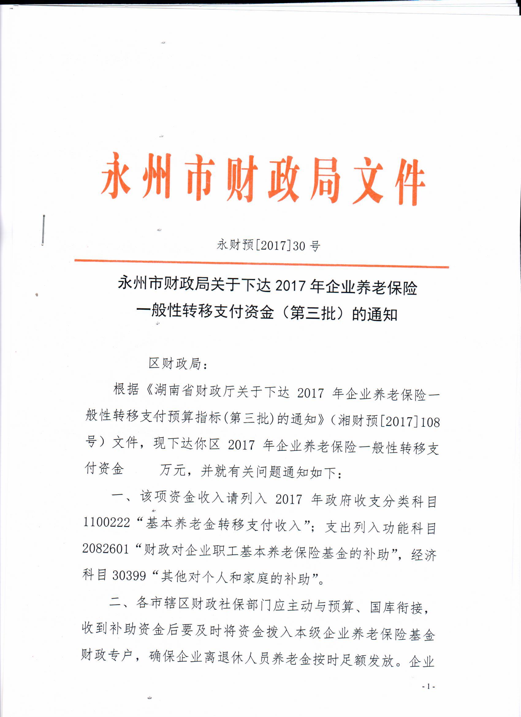 永州市财政局关于下达2017年企业养老保险一般性转移支付资金(第三批)的通知