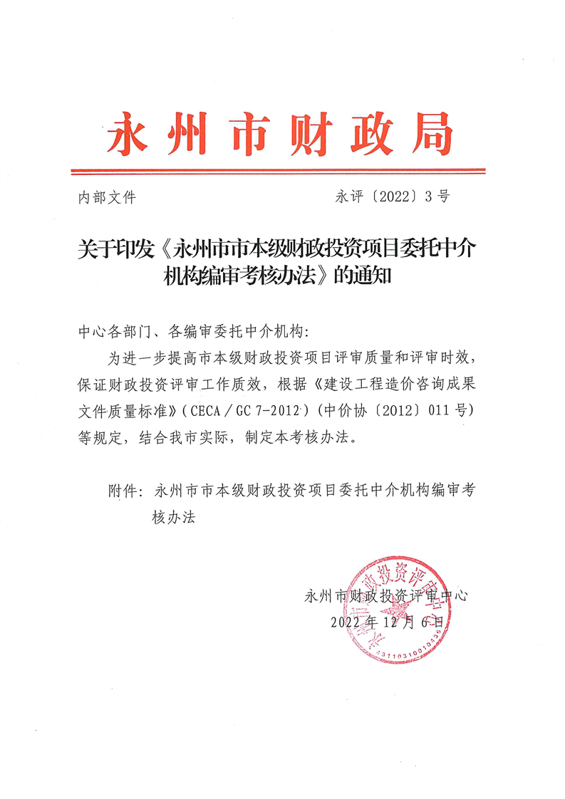 关于印发《永州市市本级财政投资项目委托中介机构编审考核办法》的通知(永评〔2022〕3号)