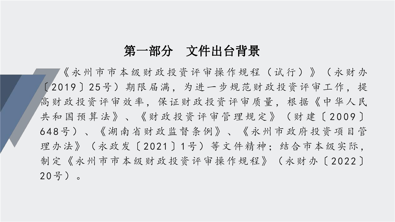 《永州市市本级财政投资评审操作规程》(永财办〔2022〕20号)政策解读(PPT解读)