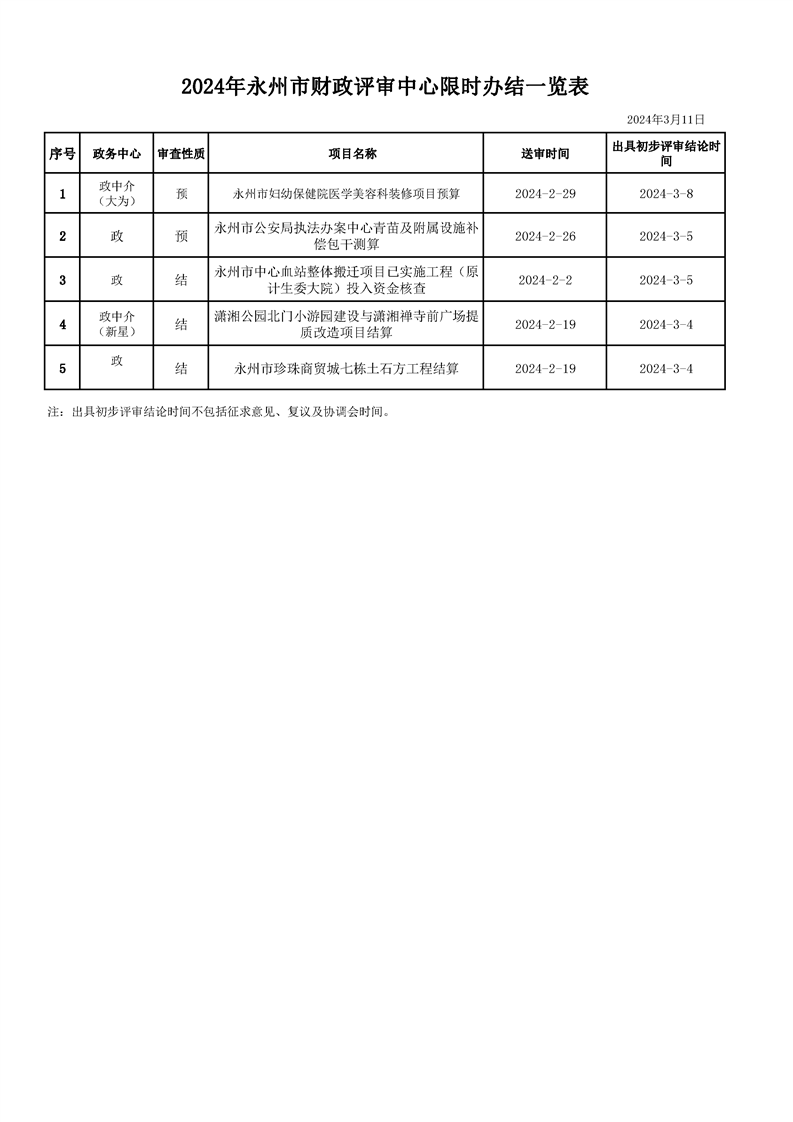 2024年永州市财政评审中心限时办结一览表(2024年3月11日)